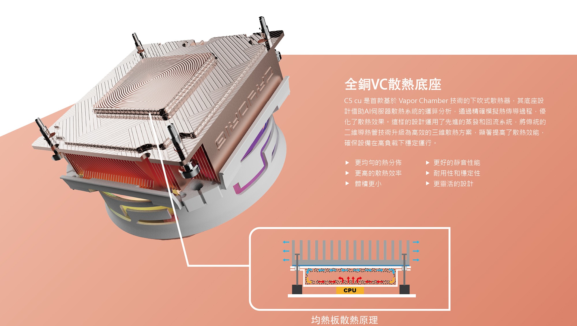 C5 與 C5 CU 不只是下吹式散熱器,更是為有限空間打造的極致效能解決方案,專為講究表現與質感的玩家而生。