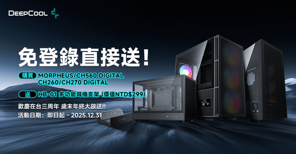【2025年11月台北訊】 知名散熱品牌大廠 – DeepCool 九州風神在台三周年慶, 專屬好禮大放送!! 只要在活動期間內, 購買 DeepCool 九州風神指定型號電腦機殼, 即送指定機殼專款專用超實用的多功能耳機架 (市價:NTD$299), 數量有限、機會難得、敬請把握!