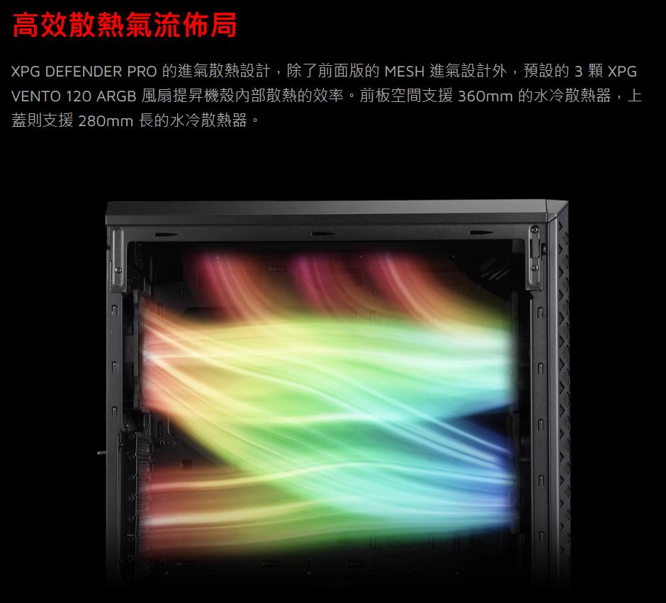 高效的氣流佈局,預裝 3 顆 XPG VENTO 120 ARGB 風扇