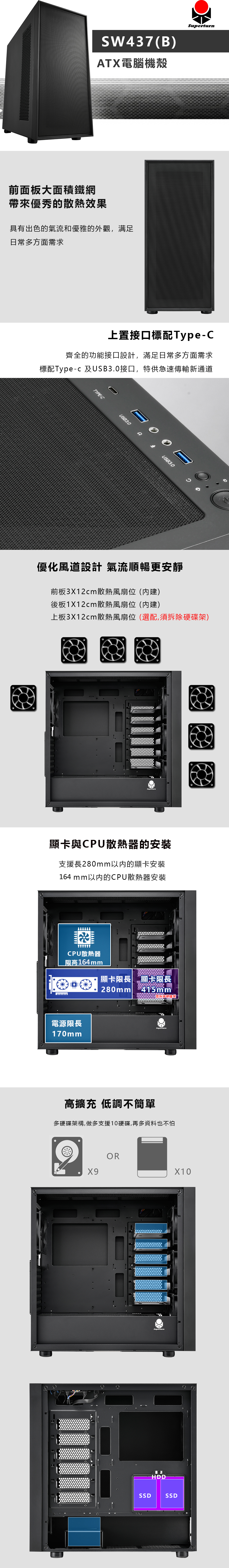 前面板鐵網孔設計, 內建 120mm 4個風扇
