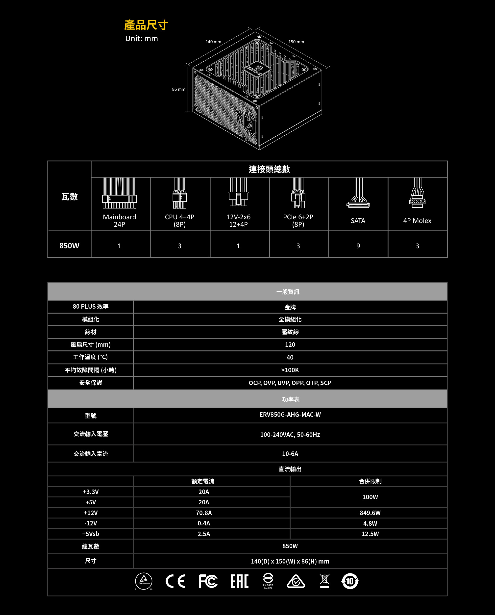 通過80 PLUS®金牌認證,, 轉換效率高達 ≧ 90%