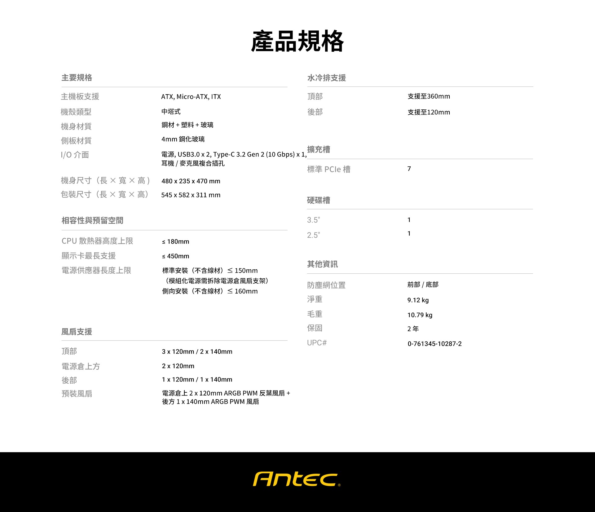 - 預裝 2 x120mm ARGB PWM 反葉進氣風扇